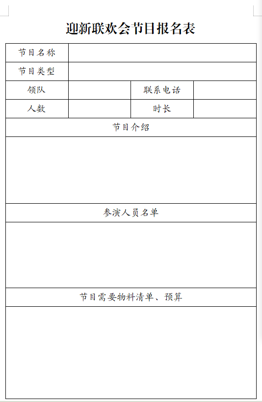 请有意参与节目表演的老同志,认真填写《迎新年联欢会节目报名表》(附后),并于2025年12月10日前将报名表交至离退休人员工作处郭玮老师处。我们将对节目进行统筹编排,力求内容丰富、形式多样、适合老同志参与。